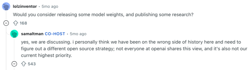 Even though OpenAI said early on that it would publish research and data about their models if it was in the public’s interest, it later switched to a proprietary model. Sam Altman now thinks that OpenAI has been on the wrong side of history and may be doubling back to an open-source model.