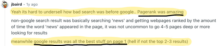 Now, 30 years later, the search engine wars are history, and Google is the clear victor. Interested in what people who were around at the time Google first rolled out PageRank and began to explode in popularity had to say, I looked into a Reddit thread where users discussed how bad search engines were before Google.3 The responses were consistent: Google truly was 10x better than any other competitor at the time.
