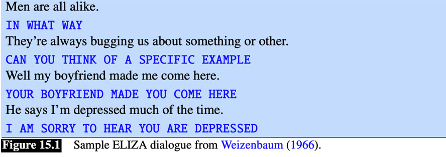 Weizenbaum made use of this property of Rogerian psychiatric conversations, along with clever regular expressions, to allow ELIZA to interact in ways that seemed deceptively human-like.”6