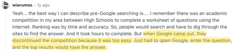 Searching for information on the internet was actually so bad before Google PageRank that there was literally an academic competition where students had to complete a worksheet of questions for time and accuracy using only the internet. Once Google came out, they had to shut down the competition because it became too easy.