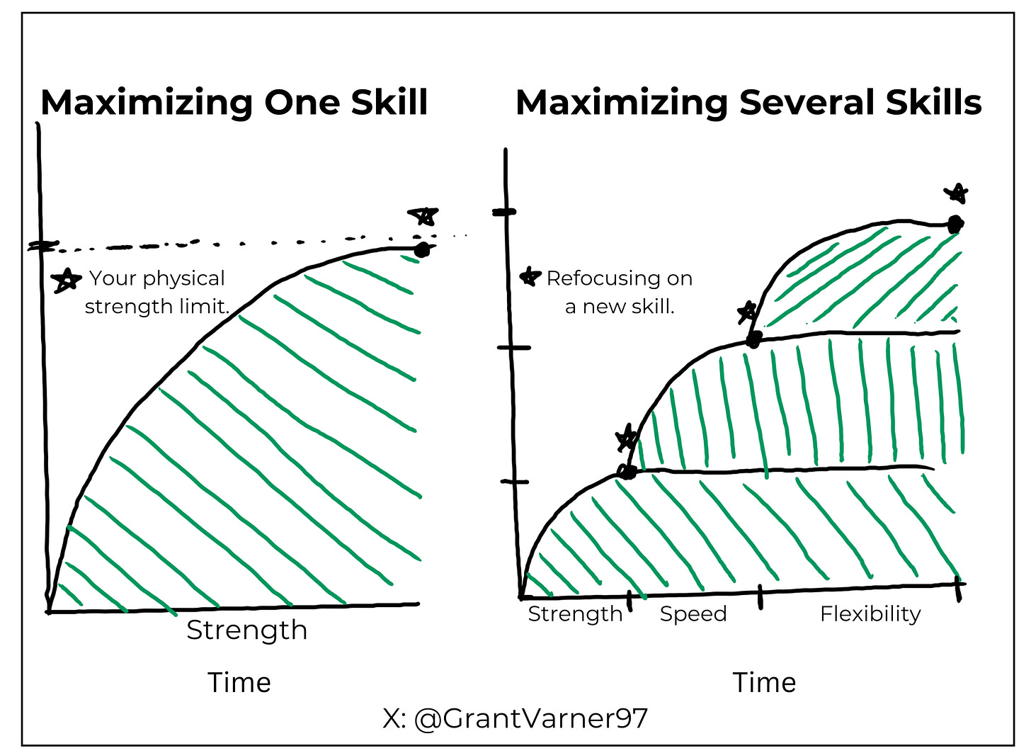 In asymptotic growth domains, focus on improvement until your limit, then finding related areas to grow. Hit your max in bench press? Work on flexibility next.