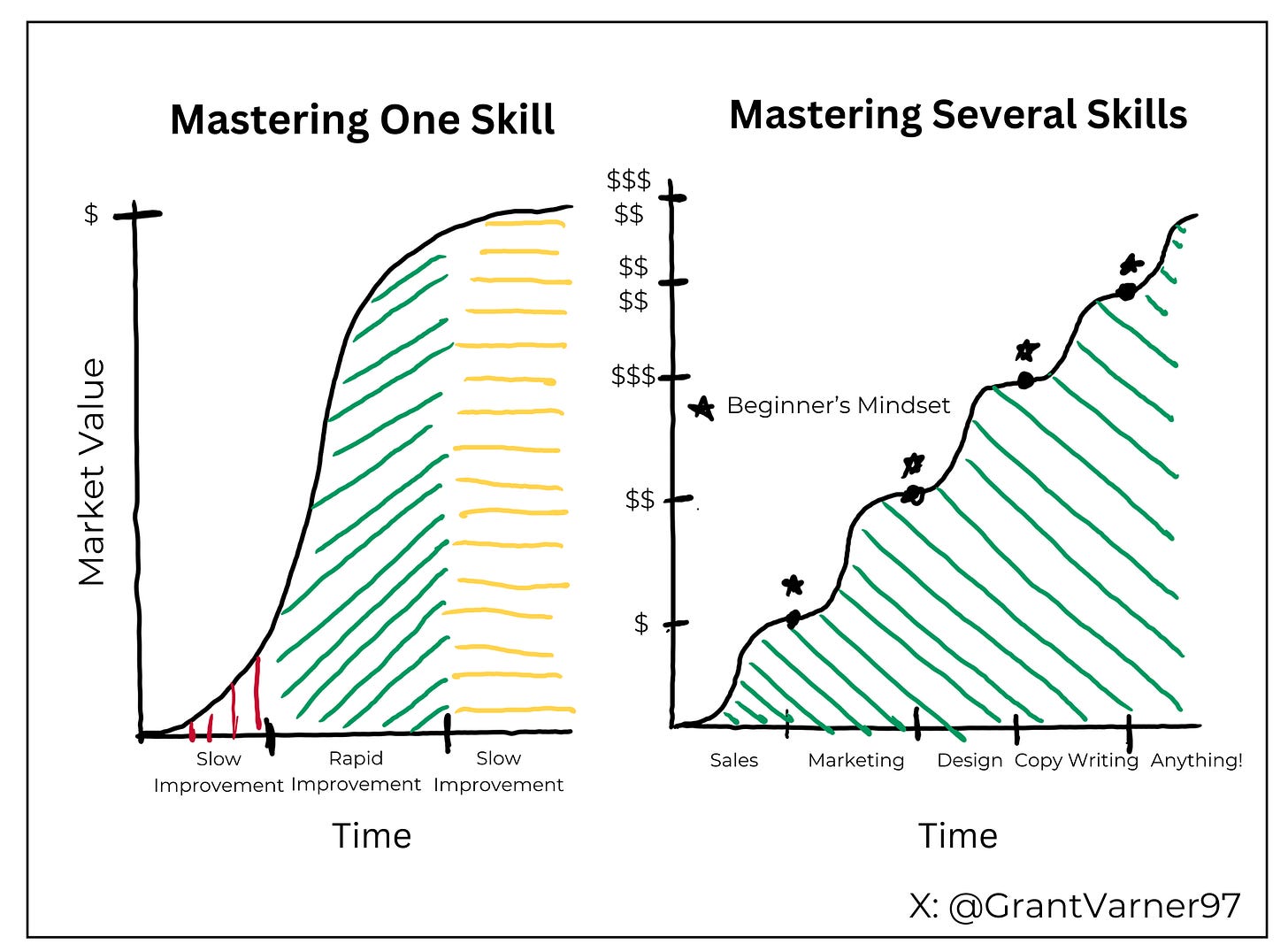 In S-Curve growth domains, you need to consistently focus on becoming an expert, followed by dropping your ego, and readopting a beginners mindset to continue progressing.