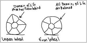 A balanced wheel rolls much faster, and is much more effective at getting you where you need to go than an unbalanced wheel. Much like the improvement you can make when all domains of your life are perfectly balanced. Through an ongoing process and discipline needed to sustain that balance over time.