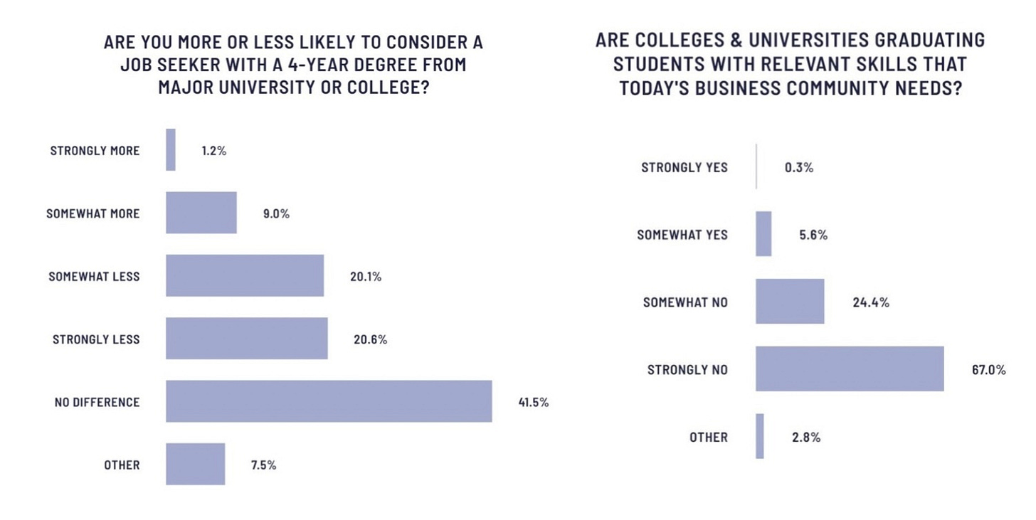 What’s more is that a 2023 study of 70,000 small business leaders found that 90% of business thought colleges aren’t giving students the skills they need to succeed.