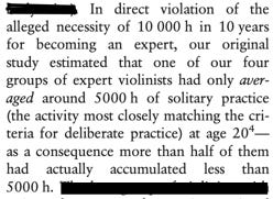 Ericsson found that among elite violinists, the average amount of solitary practice within the group was only 5,000 hours. And more than half accumulated less than 5,000 hours of solitary practice.