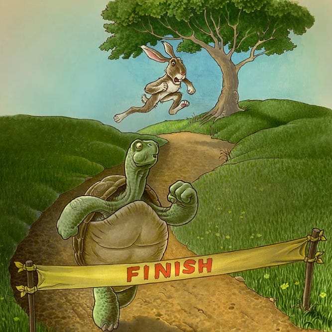 In the proverbial story of the tortoise and the hare, the hare loses the race because the he had the overconfidence to take a nap at the start of the race. Meanwhile, the slower tortoise instead chugged along, slowly but consistently the whole time. Eventually, he wins the race, a massive upset for the ages that all the farm animals probably talked about over beers for years to come.