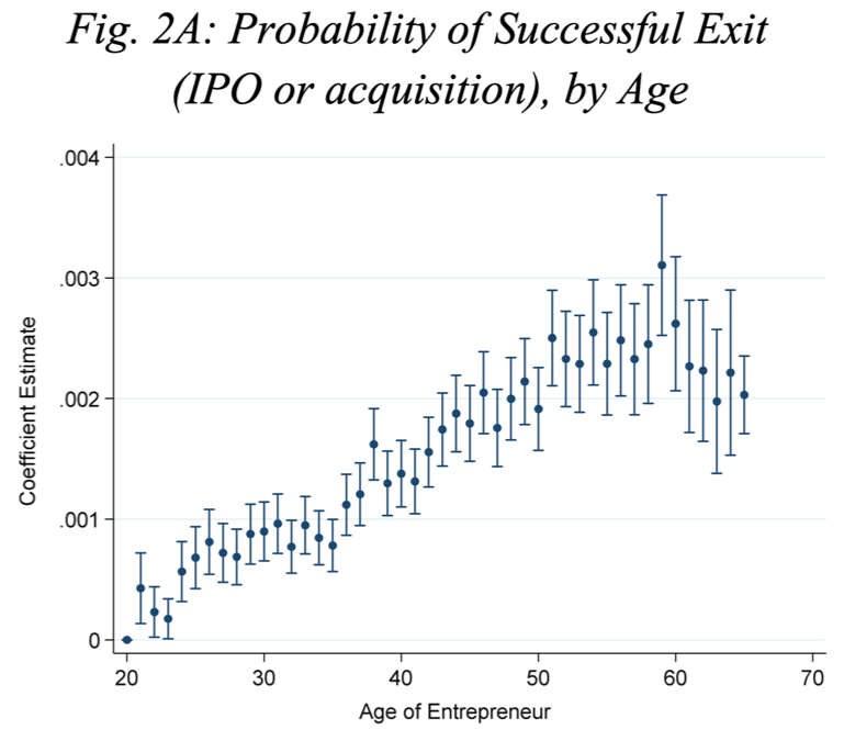 In 2019, Pierre Azoulay, Benjamin Jones, Danny Kim, and Javier Miranda conducted a study to challenge the belief that young entrepreneurs are more successful. Some theories suggest young people have advantages like sharper cognitive ability and fewer responsibilities—i.e. no mortgage, wife, kids to take care of. After analyzing data from over 2.7 million founders from 2007-2014, the results shocked even me:
